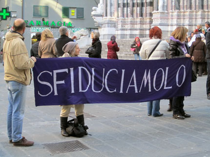 Una catena umana. Per circondare i palazzi della politica nel giorno della votazione sulla mozione di sfiducia al Berlusconi IV. È l’iniziativa che il Popolo Viola ha in programma per oggi. Luogo di ritrovo: Piazza Venezia a Roma, dove, verso le 12 e 30, confluirà il corteo degli studenti. La decisione arriva dopo che la Questura di Roma ha negato, per “preservare i luoghi delle istituzioni”, l’accesso dei manifestanti a piazza Montecitorio. LeG partecipa al corteo e al presidio previsto nel pomeriggio in piazza SS.Apostoli.