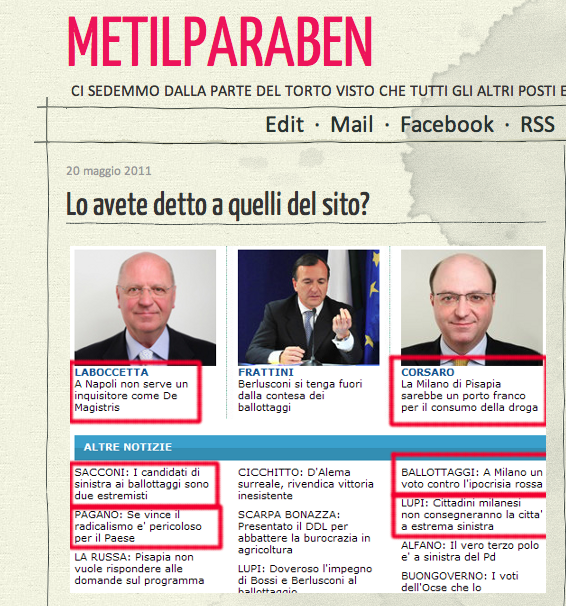 Su segnalazione di un blogger attento come Alessandro Capriccioli e del suo Metilparaben, segnaliamo a nostra volta la homepage del sito del Pdl, con dichiarazioni contro i candidati di centrosinistra al ballottaggio in questa tornata di amministrative. Le dichiarazioni più significative sono quelle di Massimo Corsaro, una carriera nel Msi e poi in An, considerato da sempre molto vicino a Ignazio La Russa e ora segretario della Commissione Bilancio alla Camera. “La Milano di Pisapia sarebbe un porto franco per la droga”, tuona.