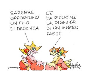 Noi proviamo scandalo per ciò che traspare dalle stanze del governo. Ma non è questo, forse, il peggio. Ci pare anche più gravemente offensivo del comune sentimento del pudore politico un Parlamento che, in maggioranza, continua a sostenerlo, al di là d’ogni dignità personale dei suoi membri che, per “non mollare” – come dicono –, sono disposti ad accecarsi di fronte alla lampante verità dei fatti e, con il voto, a trasformare il vero in falso e il falso in vero, e così non esitano a compromettere nel discredito, oltre a se stessi, anche le istituzioni parlamentari e, con esse, la stessa democrazia.