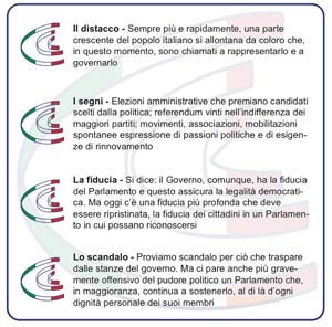 I segni del distacco sono inequivocabili, per ora e per fortuna tutti entro i limiti della legalità: elezioni amministrative che premiano candidati subìti dai giri consolidati della politica; referendum vinti, stravinti e da vincere nell’ostilità, nell’indifferenza o nell’ambiguità dei maggiori partiti; movimenti, associazioni, mobilitazioni spontanee espressione di passioni politiche e di esigenze di rinnovamento che chiedono rappresentanza contro l’immobilismo della politica.