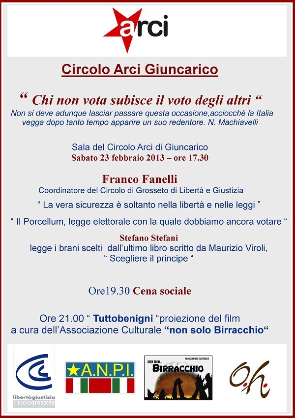 I candidati del centro sinistra, oltre agli incontri in calendario, stanno rispondendo alle nostre proposte, le “Bandiere” dell’associazione. Le risposte di Susanna Cenni e Dario Parrini, Manuela Granaiola, Elisa Simoni, deputati toscani del Pd, di Francesca Maria Marinaro, senatrice e capogruppo Pd in Commissione Politiche dell’Unione europea, di Antonio Saitta Senato PD, circoscrizione Sicilia e di Salvatore Mammola, candidato sempre in Sicilia per la lista Ingroia, di Valeria Fedeli, capolista Pd al Senato in Toscana, di Cristina Scaletti, candidata al Senato Toscana Centro democratico. All’interno il calendario degli incontri.