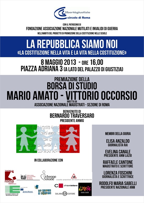 Il progetto di divulgazione della Costituzione La Repubblica siamo noi, giunto alla conclusione della terza edizione, quest’anno ha visto l’adesione di 9 istituti superiori di Roma e Latina e la partecipazione di circa duemila studenti alle “lezioni” sulla Costituzione. Nel corso della premiazione verranno comunicati i nomi dei tre vincitori tra i 300 studenti che hanno preso parte al concorso vero e propio.