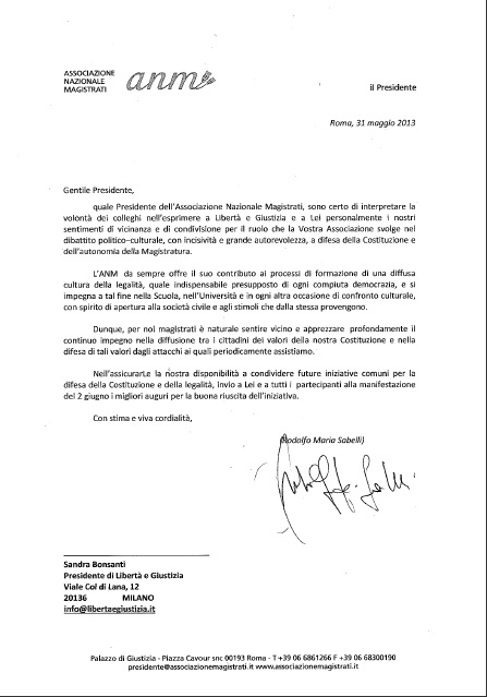 L’Associazione Nazionale Magistrati ha inviato un messaggio a Libertà e Giustizia per la manifestazione del 2 giugno. L’ANM – scrive il presidente Rodolfo Maria Sabelli – esprime sentimenti di vicinanza e condivisione per il ruolo che LeG svolge nel dibattito politico-culturale, con incisività e grande autorevolezza, a difesa della Costituzione e dell’autonomia della Magistratura. Per noi magistrati – si legge nel testo – è naturale sentire vicino e apprezzare profondamente il continuo impegno nella diffusione tra i cittadini dei valori della nostra Costituzione e nella difesa di tali valori dagli attacchi ai quali periodicamente assistiamo.