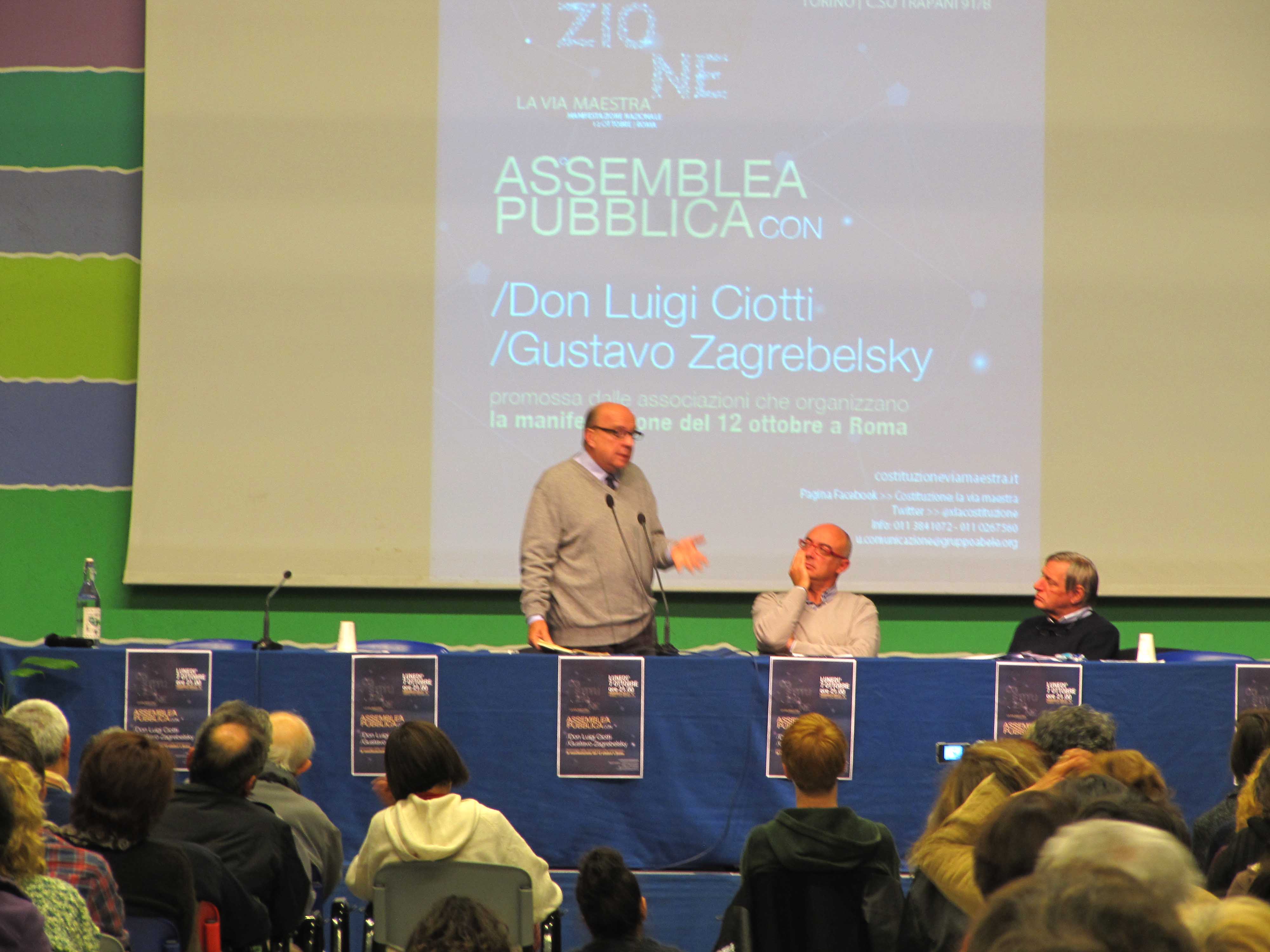 Seicento persone, silenziose (a parte gli applausi) e attente, in un clima di “insolita serenità e concentrazione”, come ha osservato Gustavo Zagrebelsky concludendo l’assemblea. L’iniziativa torinese di preparazione alla manifestazione nazionale di sabato “Costituzione. La via maestra”, partita dall’appello firmato dallo stesso Zagrebelsky, dal fondatore del Gruppo Abele don Luigi Ciotti, dal segretario della Fiom Maurizio Landini e da Lorenza Carlassare e Stefano Rodotà, si è conclusa ieri sera dopo mezzanotte nel salone di corso Trapani di fronte a oltre 600 persone.