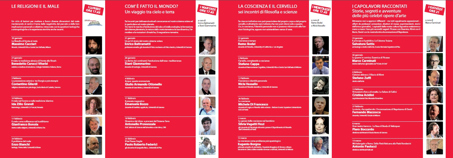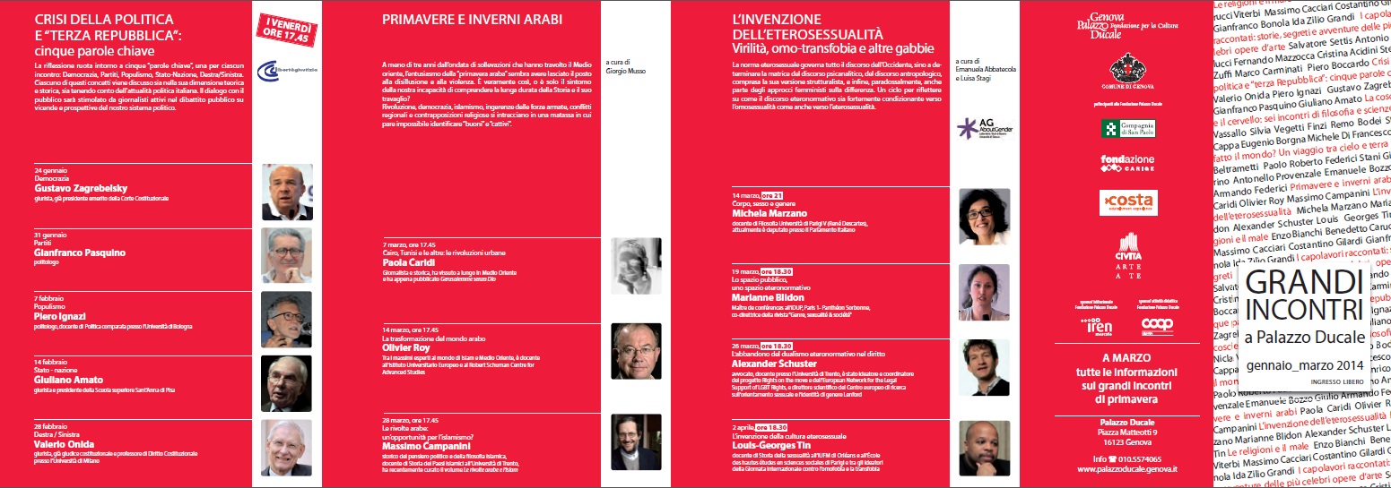 Il circolo LeG di Genova, in collaborazione con palazzo Ducale Fondazione per la cultura, organizza il ciclo GRANDI INCONTRI. Il ciclo si snoderà da gennaio a marzo intorno a sette grandi aree tematiche e vedrà la presenza di illustri testimoni.