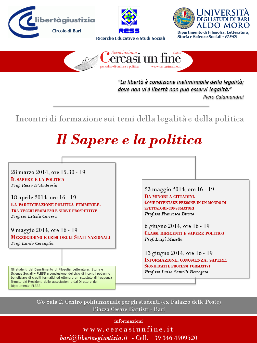 LeG Bari con RESS (Ricerche educative e studi sociali) e il Dipartimento di Filosofia, Letteratura, Storia e Scienze Sociali dell’Università degli studi di Bari Aldo Moro
