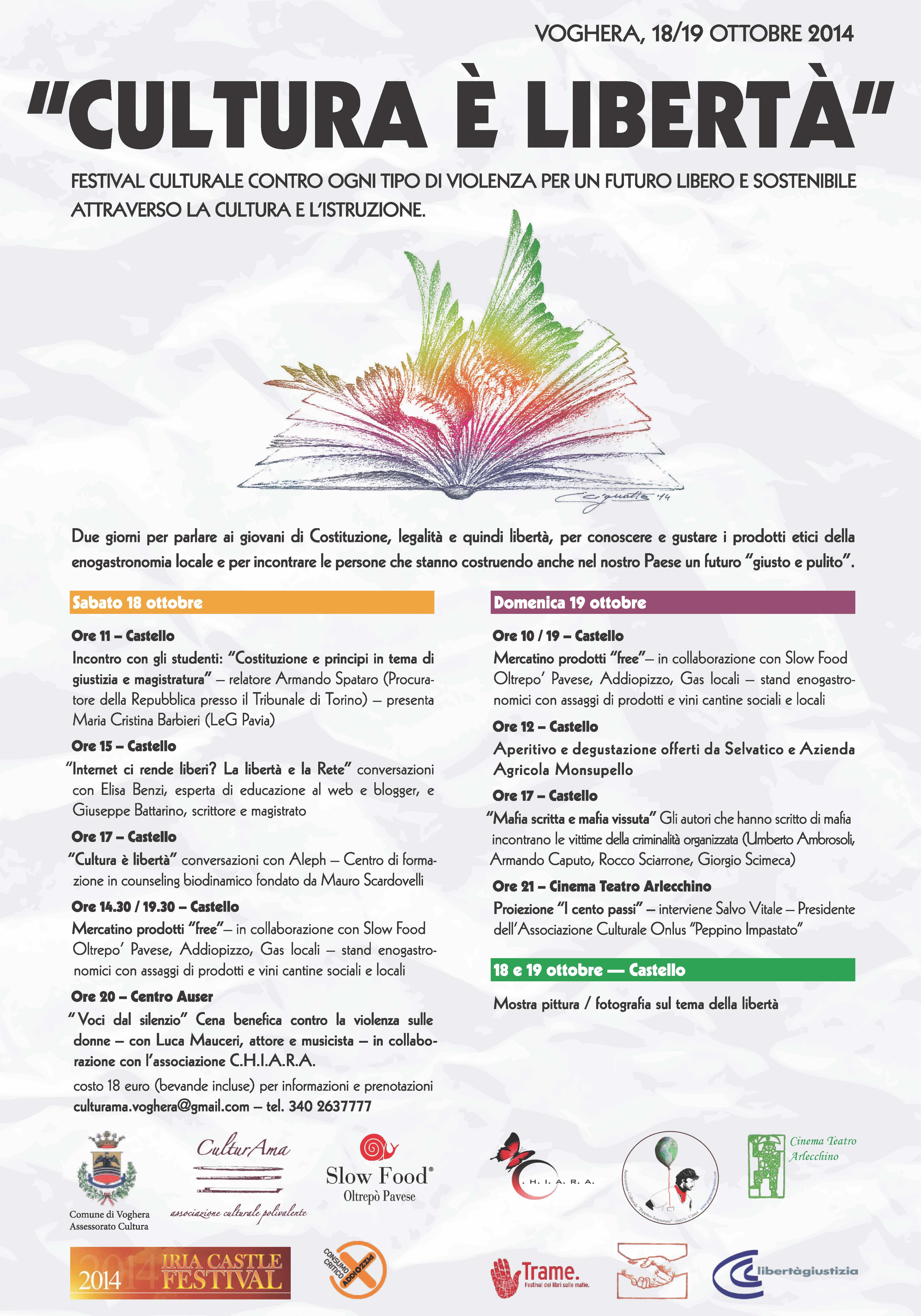 Cultura e istruzione sono il connubio ideale non solo per la libertà ma anche per progredire verso un futuro sostenibile legato alla nostra capacità di rendere l’ambiente “giusto e pulito”. I questi due giorni sarà possibile entrare in contatto con chi promuove l’enogastronamia locale grazie alla collaborazione di Slow Food Oltrepo’ Pavese, Addiopizzo e Gas locali.