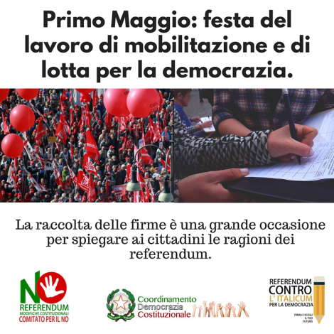 Viva il Primo Maggio festa del lavoro, viva l’iniziativa referendaria a sostegno della Costituzione nata dalla Resistenza.