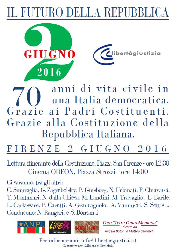 Una festa, con vecchi e nuovi amici, per i 70 anni della Repubblica. Il due giugno di quest’anno Libertà e Giustizia la dedica a un atto di gratitudine per i diritti, la libertà, la democrazia che ci sono stati donati e che dobbiamo trasmettere alle nuove generazioni. Insieme per la cultura della Costituzione con tanti maestri e giovani allievi! A Firenze, città di grandi padri costituenti.