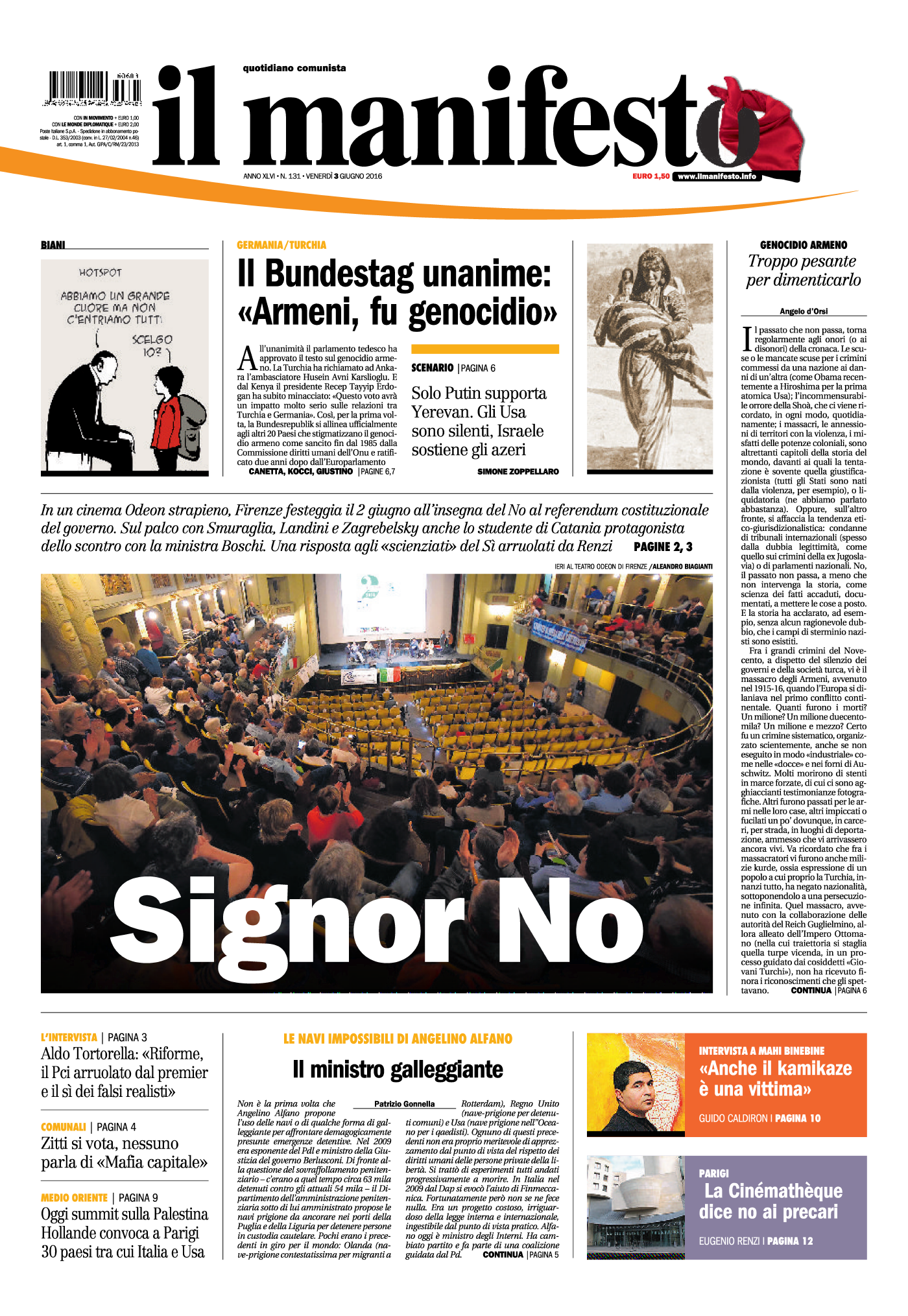 In un cinema Odeon strapieno, Firenze festeggia il 2 giugno all’ insegna del No al referendum costituzionale del governo. Sul palco con Smuraglia, Landini e Zagrebelsky anche lo studente di Catania protagonista dello scontro con la ministra …