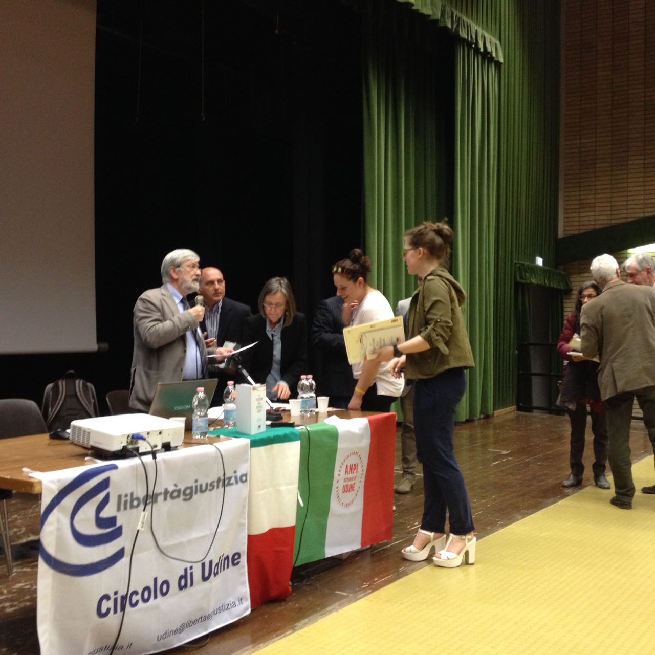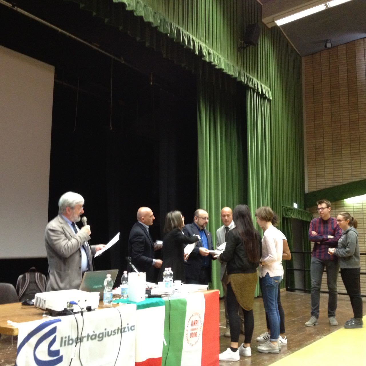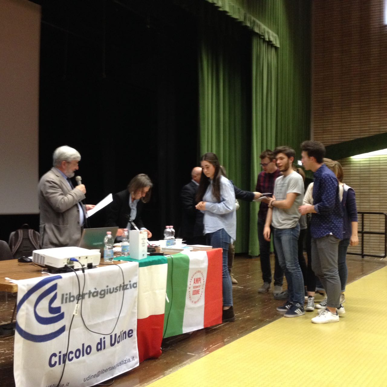 Giampieretti e Cucchini, per esempio, li hanno accomunati in unico elogio per avere saputo recepire la distinzione tra uguaglianza formale e sostanziale sottesa all’articolo 3, che a volte secondo il primo dei due relatori non è del tutto semplice fare capire persino agli studenti universitari. Tanta sensibilità degli allievi delle superiori udinesi nei confronti dei principi costituzionali ha incoraggiato Giampieretti, che era partito dalle Costituzioni come progetto tra presente e futuro, e Cucchini, che l’aveva preceduto inquadrandole invece come lascito della storia, tanto da proporre loro di farne una guida quotidiana e costante per fare valere i diritti, ma anche per rispettare i connessi doveri in una civile convivenza.