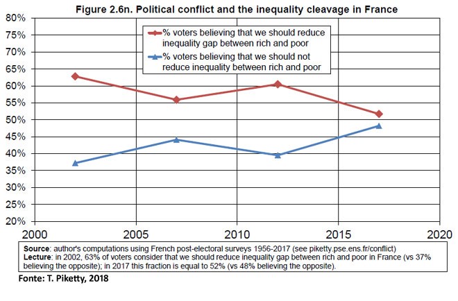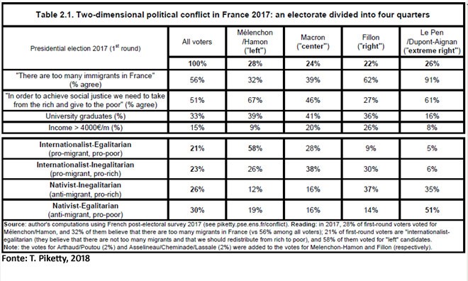 Questo fenomeno Piketty lo riscontra in tutti e tre i paesi esaminati. “Questo tipo di sistema di partiti – dice – ha poco a che fare con quello “sinistra contro destra” degli anni ’50 e ’60. Forse può essere descritto meglio come un’opposizione tra “globalisti” (alto reddito – alta istruzione) e “nativisti” (basso reddito – bassa istruzione). Questo è più o meno il modo in cui i nuovi attori politici stessi – per esempio Macron e Le Pen – tendono a descrivere ciò che percepiscono”.