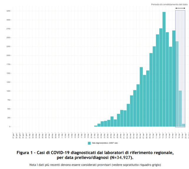 Questo il grafico che rappresenta l’andamento della curva dei contagi tra febbraio e marzo, all’inizio del manifestarsi dell’epidemia (fonte: Istituto Superiore di Sanità, in www.epicentro.iss.it )