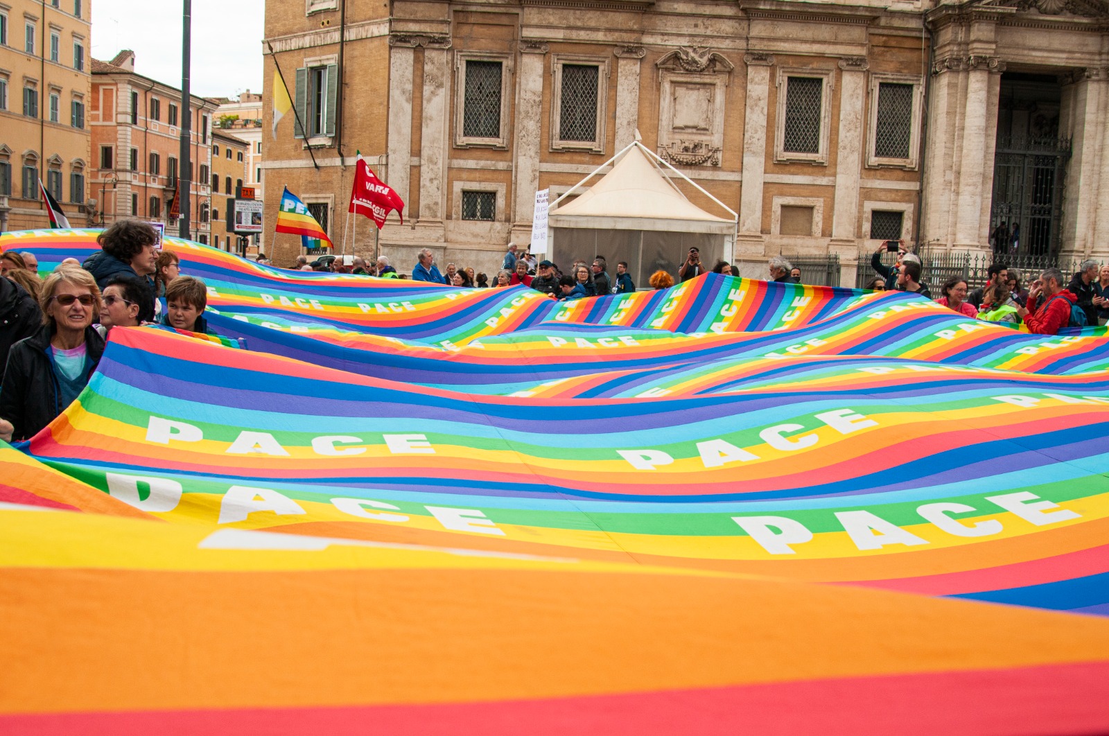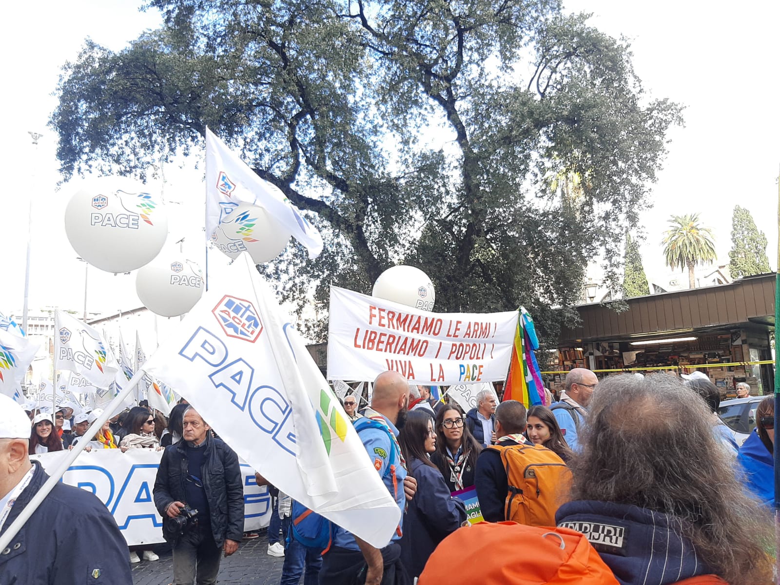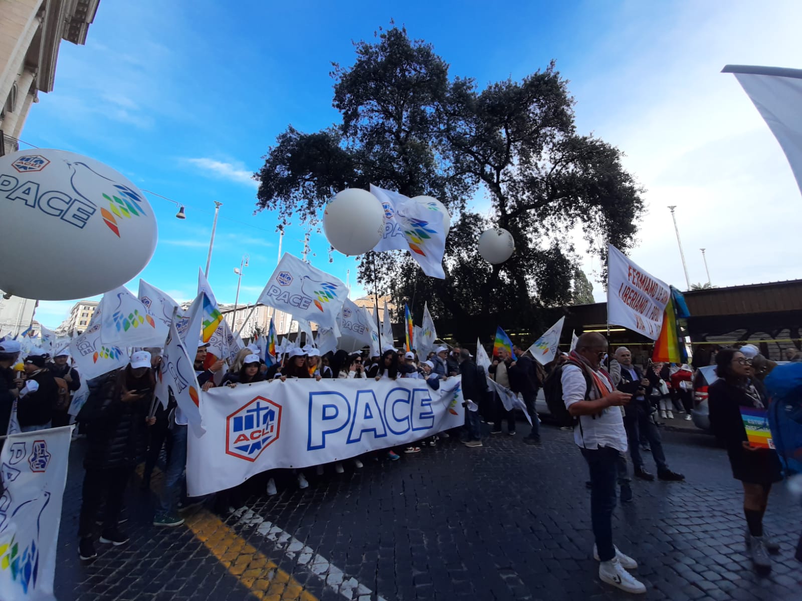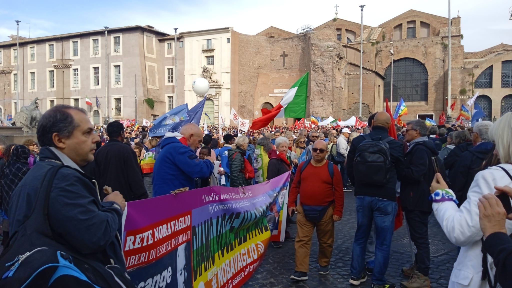 Tra i numerosi striscioni colorati e bandiere per la pace, nella manifestazione contro il conflitto russo-ucraino, ce n’è uno con le immagini simbolo di due giornalisti che si sono opposti alle censure, imposte dalle leggi e dalla propaganda di guerra. Sono Julian Assange, in carcere a Londra, e Marina Ovsyannikova, la giornalista russa della tv di stato, fuggita con la figlia dal Paese dove era agli arresti domiciliari, dopo essersi schierata contro la guerra in diretta tv.