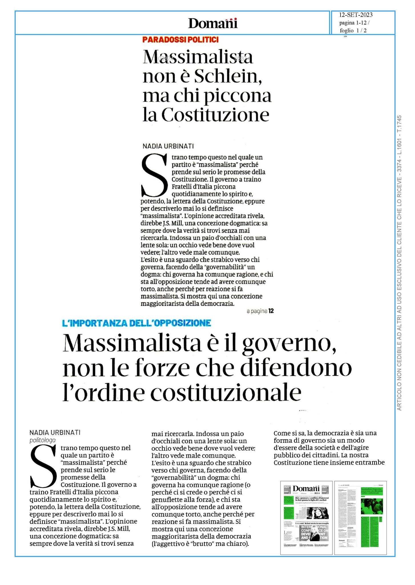 Condividiamo l’articolo di Nadia Urbinati, membro del Consiglio di Presidenza di Libertà e Giustizia, pubblicato sul Domani del 12 settembre 2023.