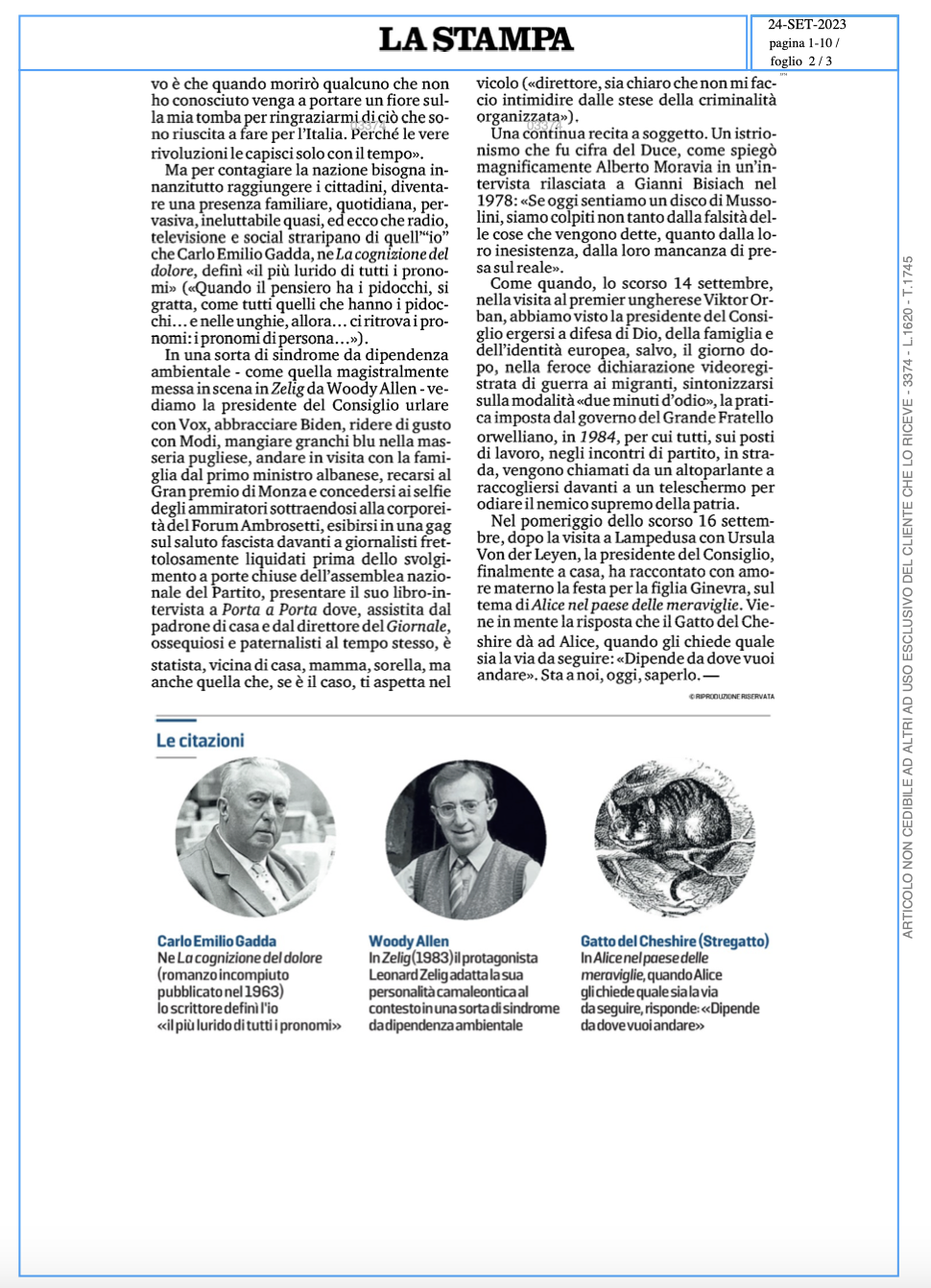 In una sorta di sindrome da dipendenza ambientale – come quella magistralmente messa in scena in Zelig da Woody Allen – vediamo la presidente del Consiglio urlare con Vox, abbracciare Biden, ridere di gusto con Modi, mangiare granchi blu nella masseria pugliese, andare in visita con la famiglia dal primo ministro albanese, recarsi al Gran premio di Monza e concedersi ai selfie degli ammiratori sottraendosi alla corporeità del Forum Ambrosetti, esibirsi in una gag sul saluto fascista davanti a giornalisti frettolosamente liquidati prima dello svolgimento a porte chiuse dell’assemblea nazionale del Partito, presentare il suo libro-intervista a Porta a Porta dove, assistita dal padrone di casa e dal direttore del “Giornale”, ossequiosi e paternalisti al tempo stesso, è statista, vicina di casa, mamma, sorella, ma anche quella che, se è il caso, ti aspetta nel vicolo («direttore, sia chiaro che non mi faccio intimidire dalle stese della criminalità organizzata»).