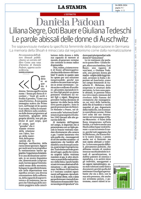 Questo testo è tratto dal libro di Daniela Padoan “Come una rana d’inverno. Conversazioni con tre donne sopravvissute ad Auschwitz: Liliana Segre, Goti Bauer, Giuliana Tedeschi”, ed è stato pubblicato su La Stampa del 24 gennaio 2024.
