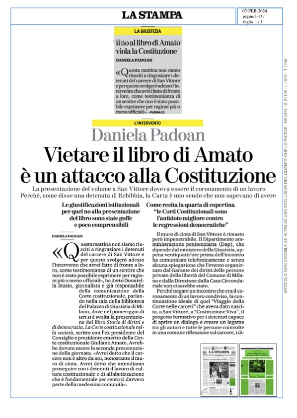 Questo articolo di Daniela Padoan, presidente di Giustizia e Libertà, è stato pubblicato su La Stampa del 7 febbraio 2024 in seguito al diniego alla presentazione del libro di Giuliano Amato e Donatella Stasio – Storie di diritti e di democrazia – nel carcere di San Vittore di Milano.