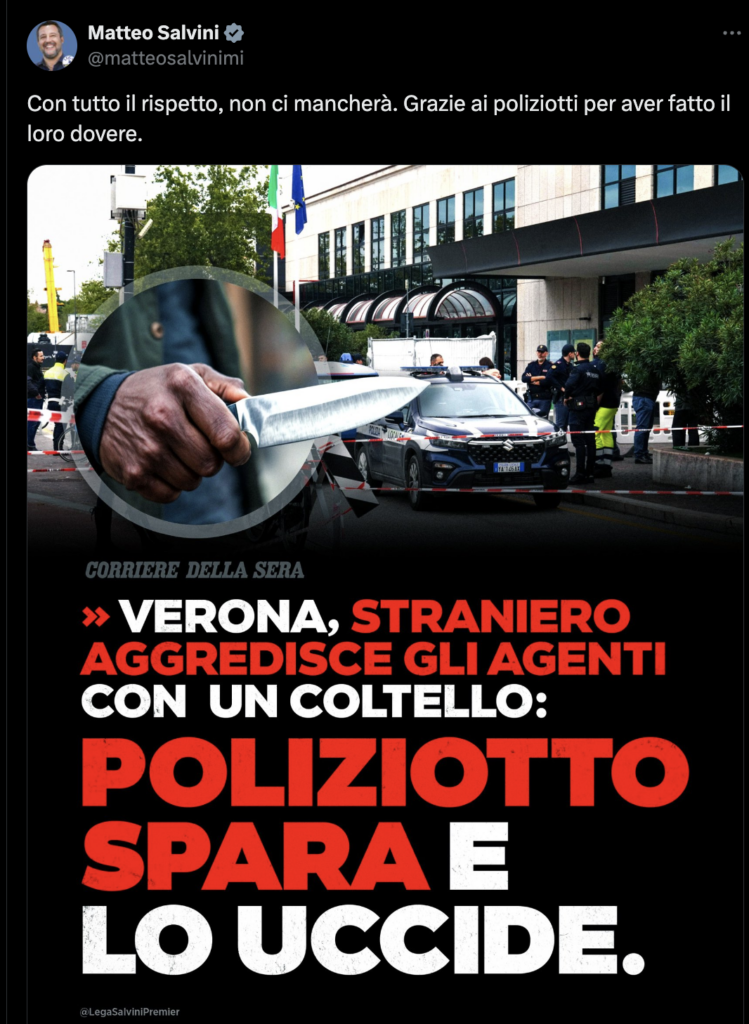 Ottobre 2024. Nell’arco di pochi giorni, in due punti diversi del continente europeo, accadono due fatti simili, accompagnati da poche parole di identico significato: in entrambi i casi, un cittadino di origini straniere non si ferma a un posto di blocco delle forze di polizia e viene ucciso dagli agenti. Uno accade nella periferia di Lisbona, l’altro davanti la stazione di Verona.