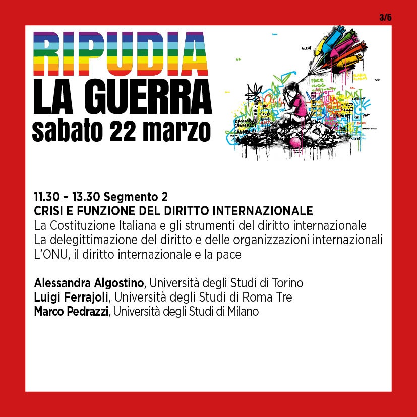 per discutere della Costituzione Italiana e gli strumenti del diritto internazionale, della delegittimazione del diritto e delle organizzazioni internazionali e sull’ONU, il diritto internazionale e la pace. Con: