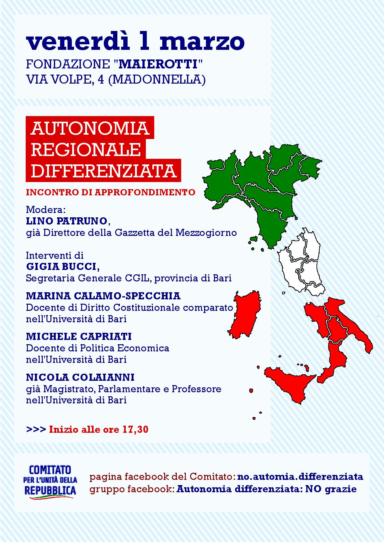 1 marzo 2019 presso la Fondazione “Maierotti”, via G. Volpe 4 (Madonella) un incontro di approfondimento sul progetto di riforma delle competenze Regionali che si traduce in una sostanziale riforma dell’assetto costituzionale dello Stato.