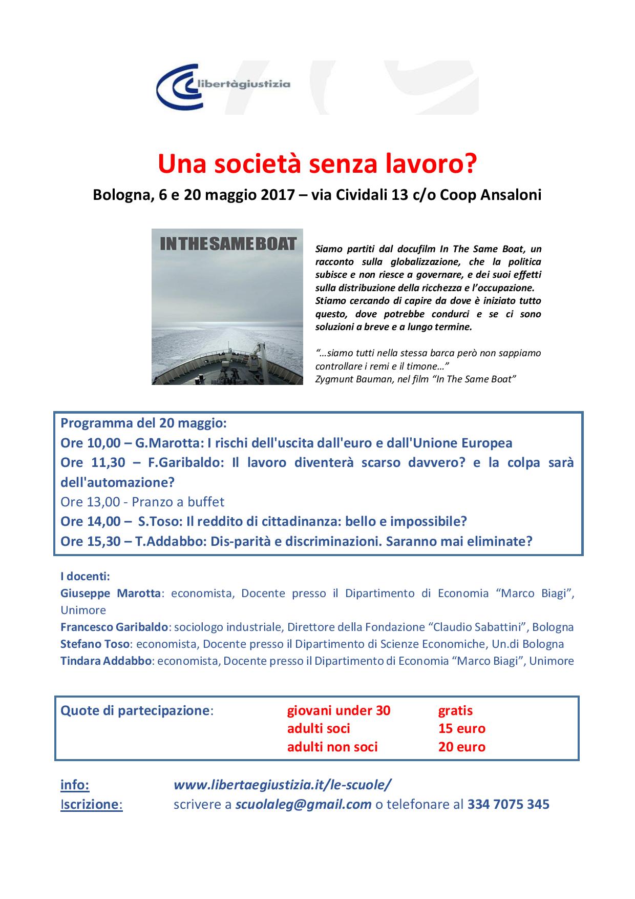 Momento importante del seminario è la proiezione del docufilm IN THE SAME BOAT di Rudy Gnutti che rappresenta di fatto il leit motiv dell’intero seminario. Si tratta di un’opera che ha richiesto due anni di lavoro nei quali sono stati intervistati alcuni grandi personaggi da Atkinson a Mujica a Bauman.
