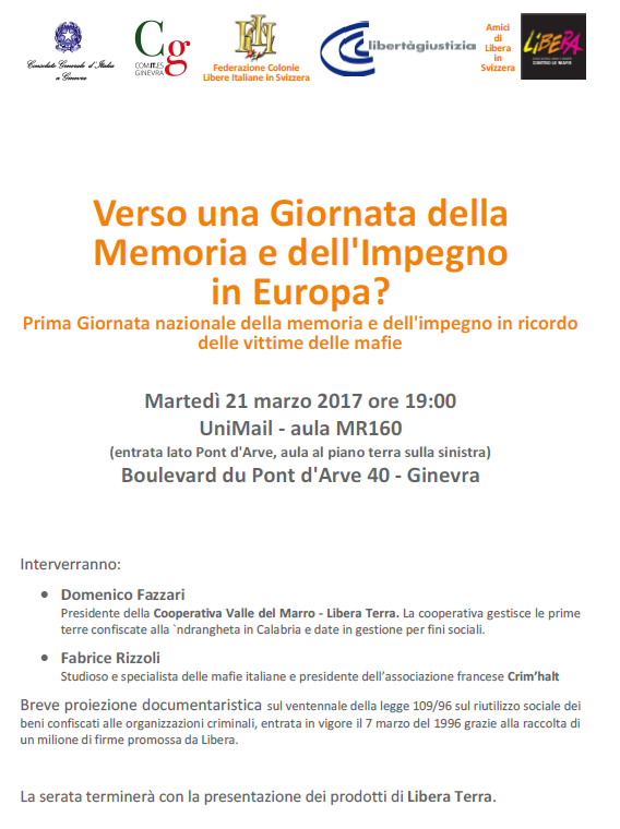 In occasione della prima “Giornata nazionale della memoria e dell’impegno in ricordo delle vittime delle mafie” (come da proposta di legge approvata alla Camera dei Deputati il primo marzo scorso), Libertà e Giustizia Ginevra é lieta di co-organizzare con “Amici di Libera in Svizzera”, “Federazione Colonie Libere Italiane in Svizzera” e “Italie: Langue Culture Société” l’incontro “Verso una giornata della memoria e dell’impegno in Europa?”.
