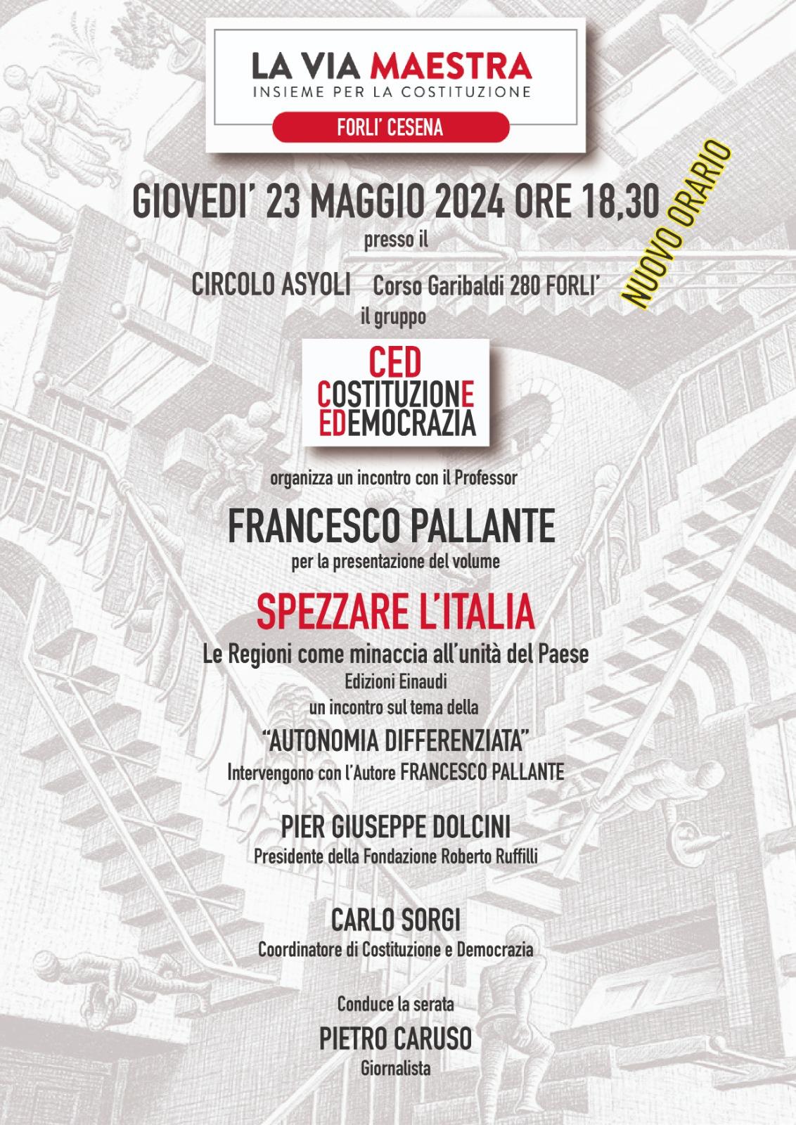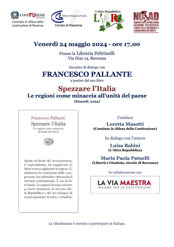 E sarà questo l’oggetto dei tre incontri promossi da un’ampia rete di associazioni: a partire da Spezzare l’Italia. Le regioni come minaccia all’unità del paese, edito da Einaudi 2024, si parlerà delle spinte autonomiste e secessioniste a Forlì il 23 maggio, e il 24 maggio, a Ravenna, nel pomeriggio, e a Faenza, la sera.