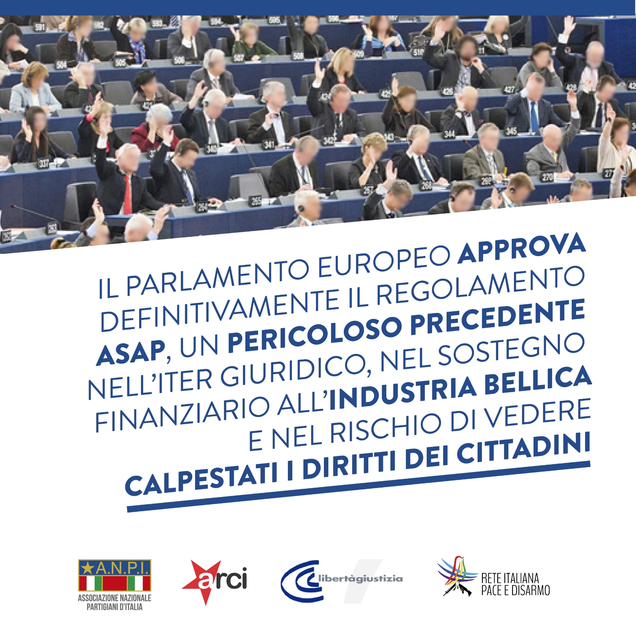 L’acronimo del testo approvato dal Parlamento europeo significa Act to Support Ammunition Production, Atto di supporto alla produzione di munizioni, ma nel linguaggio comune incidentalmente richiama a un’urgenza – As soon as possible – che è stata applicata nel dibattito politico: è così che è stato creato un fondo di 500 milioni di euro che distoglie risorse a interventi di natura sociale e cooperativa per alimentare invece una corsa alla produzione di armamenti.